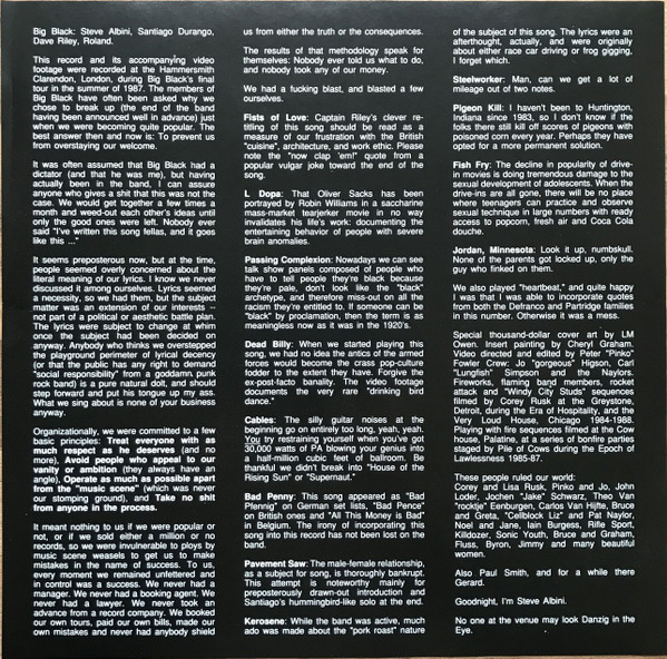 Bass: Dave Riley Guitar: Santiago Durango Guitar / Vocals / Electronic Drums [Roland The Drum Machine] / Liner Notes: Steve Albini Recorded at the Hammersmith Clarendon, London, England in Summer 1987. |