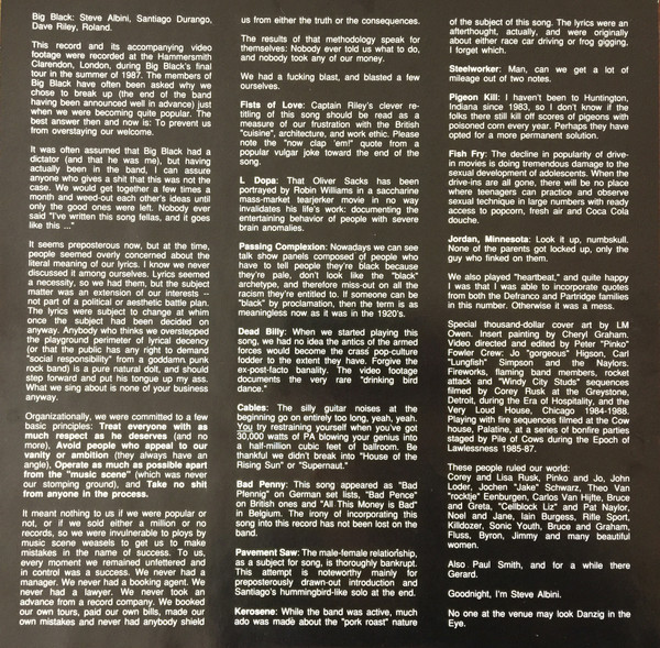 Bass: Dave Riley Guitar: Santiago Durango Guitar / Vocals / Electronic Drums [Roland The Drum Machine] / Liner Notes: Steve Albini Recorded at the Hammersmith Clarendon, London, England in Summer 1987. |
