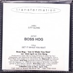 “Transfermation LABEL: CITY SLANG ARTIST: BOSS HOG TITLE: GET IT WHILE YOU WAIT TRANSFERMATION MASTERING REAR: “1. GET IT WHILE YOU WAIT 3:38 2. DRIVE ME CRAZY 2:28 3. DEDICATED 3:03” STICKER: “Boss Hog – ‘Get It While You Wait” Produced by Andy Gill (ex Gang of Four) & mixed by Tore Johansson, best known for his work with The Cardigans, this is Boss Hog’s 2nd single to be taken from the Whiteout LP released last month. Boss Hog originally formed by Cristina Martinez and Jon Spencer in 1989 as a kast minute fill-in for a cancelled group at NY’s famed CBGB’s, Boss Hog make a long awaited return to the UK for a one off headline show at LONDON’s LA2 on Mon. April 17th. Call Deb or Sean @ Mutante Inc. – 020 7729 6006″ DISC: “CITY SLANG BOSS HOG GET IT WHILE YOU WAIT |