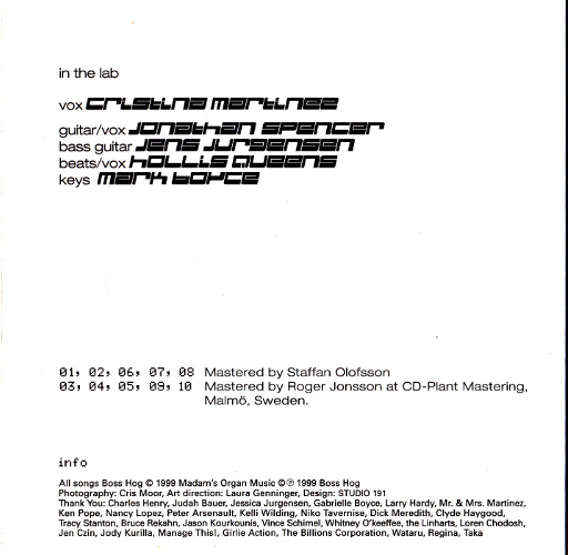 © (p) 1999 Boss Hog, All Songs: Boss Hog Published: Madam’s Organ Music Vocals: Cristina Martinez Guitar/Vocals: Jonathan Spencer Bass: Jens Jurgensen Drums/Vocals: Hollis Queens Keyboards: Mark Boyce 01. Whiteout 02. Chocolate 03. Nursery Rhyme 04. Stereolight 05. Fear For You 06. Get It While You Wait 07. Jaguar 08. Itchy & Scratchy 09. Trouble 10. Monkey |