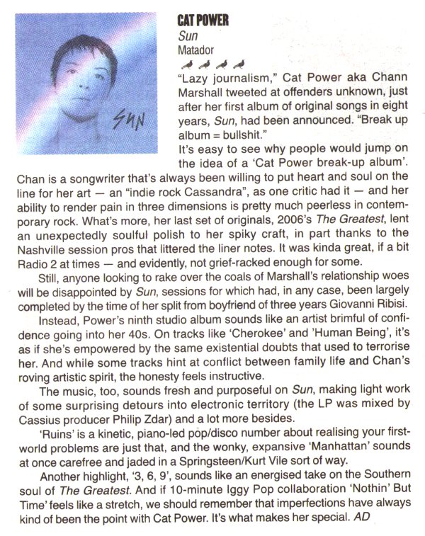 “Much has been made about Sun sounding like Chan Marshall at her happiest. I really don’t hear or agree with that assessment, but I do think that the album sounds like a woman calling the shots to her own demons.”