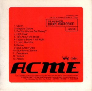 Calvin, Magical Colors, Heavy, Talk About The Blues were all released as singles. An earlier version of Attack was released on Selector Dub Narcotic and titled Blues Explosion Attack, this has much more raw live-sound and totally different lyrics. High Gear is titled Italian Country Pickup on the Japanese promo CD. The title of the song Bernie is a tribute to a Blues Explosion fan who follows the band around the country. The song was originally “called Get Down With Brian for this Dub Narcotic guy, but Albini called it Get Down With Bernie. We shortened it as a tribute to him and to the friends of the Blues Explosion.” – extract from Rolling Stone article Track X Track. The song Talk About The Blues was written as a direct response to a Rolling Stone review of Now I Got Worry and Q&A with Jon Spencer and the title is a reference to I Do Not Play Not Rock ‘n’ Roll by Mississippi Fred McDowell. The song is discussed in detail in both a CMJ New Music Monthly article titled ‘Acme Blues Explosives, INC’ and a later Rolling Stone interview. Talk About The Blues was commercially released as single on 7″ (UK), CD (UK/US) and 12″ (UK/US). In 2010 Shout! Factory / Shove! Records issued Acme + Acme Plus as a double CD with numerous additional tracks. |