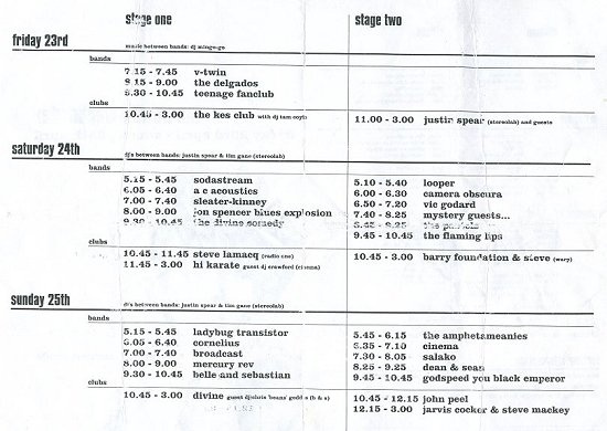The Jon Spencer Blues Explosion set at the Bowlie Weekender, Camber Sands, Sussex, UK with Sodastream, AC Acoustics, Sleater Kinney, The Divine Comedy, Looper, Camera Obscura, Vic Godard, “mystery guests”, The Pastels and The Flaming Lips on 24 April 1999.