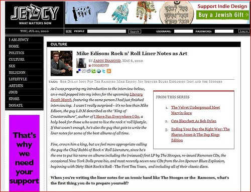 As I was preparing my introduction to the interview below, an e-mail popped into my inbox for the upcoming Literary Death Match, featuring the same person I had just finished interviewing. I wasn’t really surprised– it’s no less than Mike Edison, the guy L.D.M described as the “King of Counterculture”, author of I Have Fun Everywhere I Go, a holy book for those who want to live the rock n’ roll lifestyle. If that wasn’t enough, he’s also the guy that gets to write the liner notes for some of the best albums of all time.