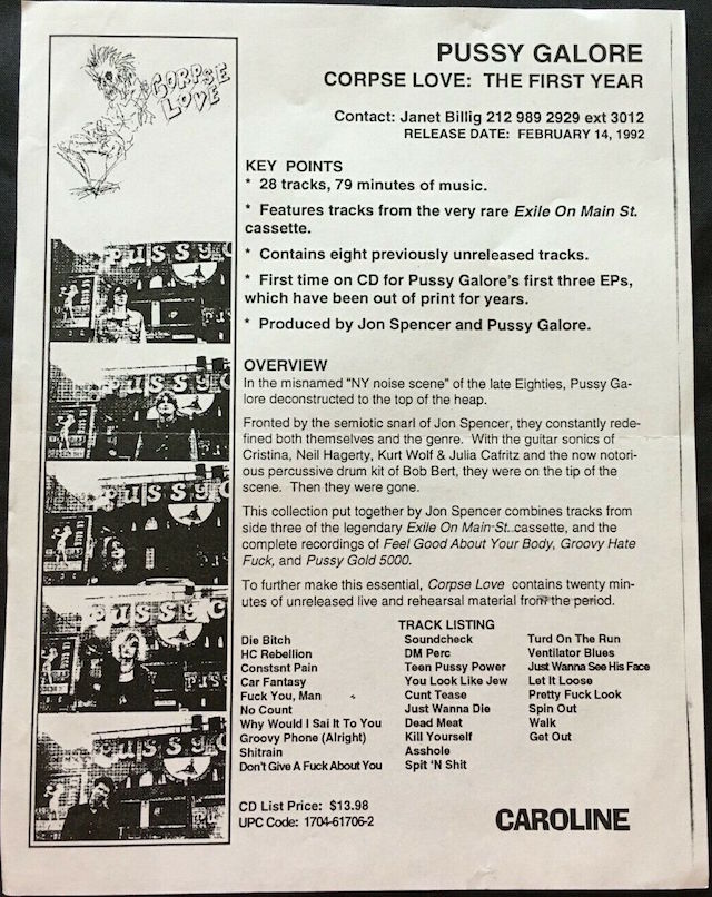 | Press release for the Pussy Galore compilation Corpse Love. |