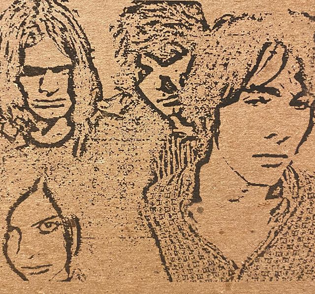 Image of Pussy Galore laser etched on heavy recycled paper based on a black and white promotional photo by Michael Lavine.