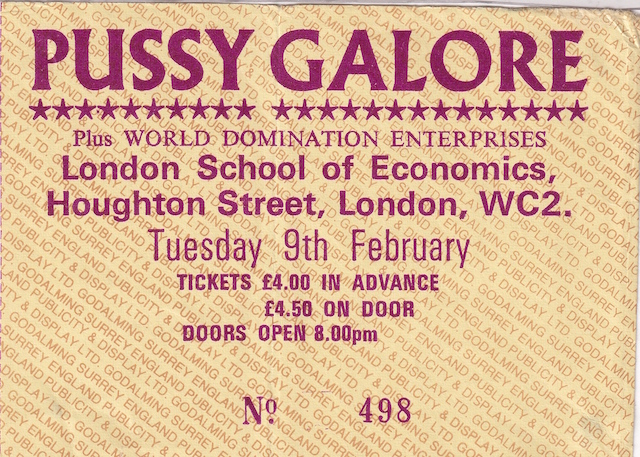Pussy Galore show at London School of Economics, Houghton Street, London WC2A 2AE, UK with World Domination Enterprises and Mute Drivers on 9 February 1988.