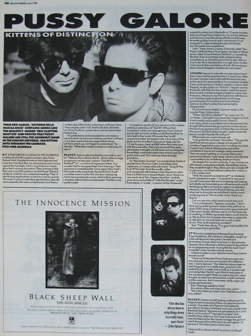 Last ever interview with Pussy Galore from Melody Maker promoting the release of Historia De La Musica Rock.