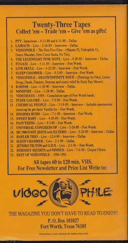 | Videophile #12: 7-9-89 is Pussy Galore live at the Axis Club, Fort Worth, Texas which shows the band performing near the end of their career, their last show would be at CBGB’s on 5 August 1989, six songs from this were broadcast as a Peel Session on 25 July 1990 and the full show was released as Live: In The Red.
