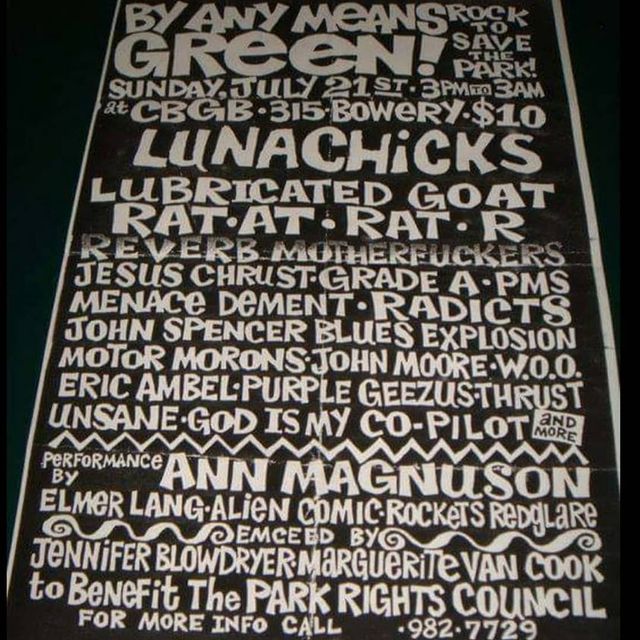 “By Any Means Green!” benefit show with Cop Shoot Cop, Lubricated Goat, Rat.At.Rat.R, Reverb Motherfuckers, Jesus Christ, Grade A, PMS, Menace Dement, Radicts, Motor Morons, John Moore, W.O.O., Eric Ambel, Purple Geezus, Thrust, Unsane, God is My Co-Pilot with Performances by Ann Magnuson, Elmer Lang, Alien Comic, Rockets Redlarge and emcee’s Jennifer Blowdryer and Marguerite Van Cook.