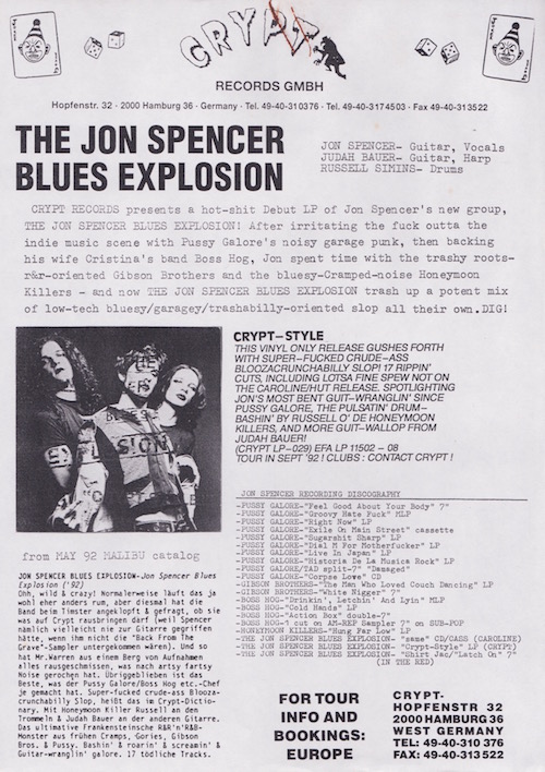 | Press release included with promotional copies of The Jon Spencer Blues Explosion album Crypt Style along with a photo of the band. |
