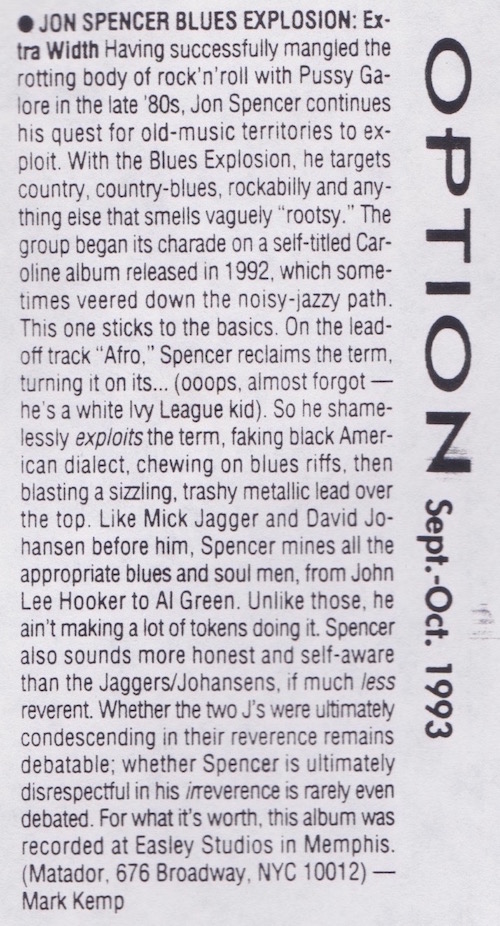 | Review of The Jon Spencer Explosion album Extra Width from Option magazine.