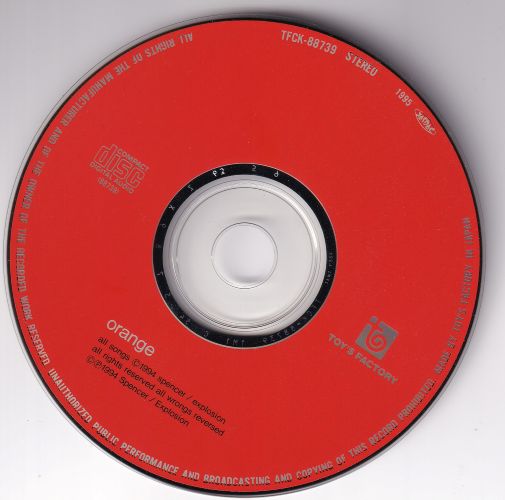 Photos by Michael Lavine BOOKLET: Lyrics in English and Japanese by Akiyama Sisters Inc. DISC: “TFCK-88739 STEREO 1995 JASRAC. All rights of the manufacturer and of the owner of the recorded work reserved. Unauthorized public performance and broadcasting and copying of this record prohibited. Made by Toy’s Factory. In Japan. [Compact Disc and Toy’s Factory logos] (88739) Orange. all songs © 1994 spencer / explosion. all rights reserved all wrongs reversed ©(p) 1994 Spencer / Explosion.” REAR: Tracklisting, ‘thank you’ list (see sleeve notes), song credits, “©(p) 1994 Spencer / Explosion” and “Licensed from Jon Spencer through Jade Music Co. Ltd. Manufactured by Toy’s Factory, Tokyo, Japan, 1995. Stereo. 95.4.26 (94.9.15) TFCK-88739. 97.4.25” OBI: Titles, Price, Barcode, TFCK-88739, Stereo and adverts for ‘Boss Hog – Girl + (CD, JAPAN)’ and ‘Jon Spencer Blues Explosion – Extra Width (CD, JAPAN)’. |