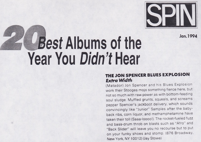 | Part of Spin magazine’s 20 Best Albums of the Year You Didn’t Hear featuring The Jon Spencer Explosion album Extra Width. |