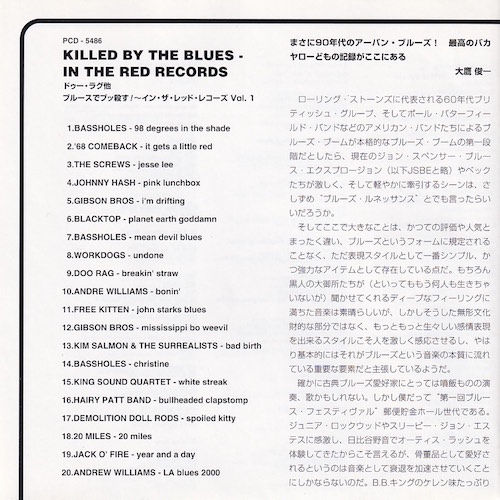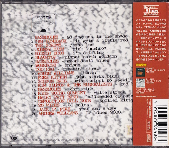 | 01. Bassholes – 98 Degrees In The Shade Writer: Texas Alexander Vocals & Guitar: Don Howland Drums: Rich Lillash Released as a single in March ’92 ITR-008 02. ’68 Comeback – It Gets A Little Red released as a single in Feb. ’93 ITR-016 03. The Screws – Jesse Lee from the album “The Screws” released Jan. ’98 ITR-060 04. Johnny Hash – Pink Lunchbox released as a single in Feb. ’93 ITR-017 05. Gibson Bros. – I’m Drifting released as a single in March ’92 ITR-009 06. Blacktop – Planet Earth Goddamn from the album “I’ve Got A Baaad Feeling About This” released Jan/ ’95 ITR-027 07. Bassholes – Mean Devil Blues from the album “Haunted Hill” released Sept. ’94 ITR-026 08. Workdogs – Undone released as a single July ’94 ITR-12 09. Doo Rag – Breakin’ Straw released as a single March ’95 ITR-021 10. Andre Williams – Bonin’ from the album “Silky” released April ’98 ITR-056 11. Free Kitten – John Starks Blues released as a single in Aug. ’94 ITR-015 12. Gibson Bros – Mississippi Bo Weevil from the album “Columbus Soul ’85” released June ’96 ITR-034 13. Kim Salmon & The Surrealists – Bad Birth from the album “Hit Me With The Surreal Feel” re-released May ’96 ITR-033 14. Bassholes – Christine from the album “Haunted Hill” released Sept. ’94 ITR-026 15. The King Sound Quartet – White Streak from the album “The Getdown Imperative” released Feb. ’97 ITR-052 16. Hairy Patt Band – Bullheaded Clap Stomp released as a single in March ‘9 ITR-047 17. Demolition Doll Rods – Spoiled Kitty released as a single in Feb. ’96 ITR-040 18. 20 Miles – 20 Miles released as a triple single in May’96 ITR-040 19. Jack O’ Fire – Year And A Day released as a single in Jan ’95 ITR-023 20. Andre Williams – La Blues 2000 from the upcoming album “Da Hottest Ticket In Town” out 1999! |