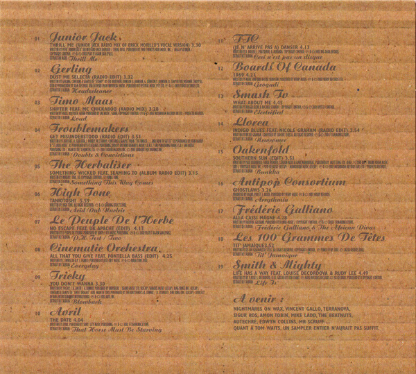 | 1.01. múm – Green Grass of Tunnel 1.02. Zero 7 – Distractions (Radio Edit) 1.03. Terry Callier – Brother To Brother 1.04. Papa Noel & Papi Oviedo – Kin Havane (Radio Edit) 1.05. Les Enfants Des Autres – Carmina Blues 1.06. The Hives – Main Offender 1.07. La Musica Della Mafia – Non C’é Pirdunu 1.08. 20 Miles – Only One 1.09. Miossec – Tonnerre (Remix) 1.10. Reindeer Section, The – You Are My Joy 1.11. Promise Ring, The – Stop Playing Guitar 1.12. Garbage – Breaking Up The Girl 1.13. Percubaba – Le Meka 1.14. Léoparleur – Revoir La Mer 1.15. 16 Horsepower – Blessed Persistence 1.16. Karin Clercq – Mes Petites Errances 1.17. The D4 – Rocknroll Motherfucker 1.18. Solomon Burke – Don’t Give Up On Me 1.19. Millionaire – Come With You 1.20. Millencolin – Kemp 1.21 Guided By Voices – Everywhere With Helicopter 2.01. Junior Jack – Thrill Me (Junior Jack Radio Mix of Eric Morillo’s Vocal Version) |