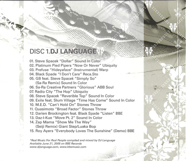 | Disc 1 (Mixed by DJ Language): 01. Dollar – Steve Spacek 02. Now Or Never – Platinum Pied Pipers 03. Hideyaface – Prefuse 73 04. I Don’t Care – Black Spade 05. Simply So – GB Feat. Steve Spacek 06. Glorious – Sa-Ra 07. The Hop – Radio City 08. Reverible Top – Steve Spacek 09. Time Has Come – Exile Feat. Slum Village 10. Can’t Hold On – M.D.S. 11. Broad Factor – Quasimoto 12. Listen – Darien Brockington Feat. Black Spade 13. Move Pt. 2 – Daz-I-Kue 14. Show Me The Way – Zap Mama 15. Everybody Loves The Sunshine – Roy Ayers Disc 2 (mixed by dave P & Justine D): |