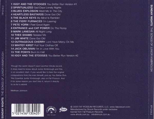 For decades Junior ran a raucous juke joint near Chulahoma, Mississippi, and all of his albums channel the intensity of that steamy, smouldering environment, he did not even release an album before he was 62; before then, his recorded output was limited to a handful of one off tracks. In the six years before he died, however, Junior made his mark. More important, his mesmerizing, bone-chilling guitar lines, ageless and timeless, continue to make their way out in the world, leaving no one who has heard them at all the same. -Anthony DeCurtis” “Though the world doesn’t need another tribute record, it does need to know about Junior Kimbrough and this is an excellent start. If you would like to hear the original compositions from the man himself, pick up You Better Run, The Essential Junior Kimbrough, also on Fat Possum. And if for some reason you don’t like it, return it directly to us for a refund. – Matthew Johnson” All songs published by Mockingbird Blues administered by Wixen Music (BMI) except 7, 10 and 14 published by Big Legal Mess administered by Wixen Music (BMI). Iggy Pop appears courtesy of Virgin records. Spiritualized appears courtesy of Sanctuary Records. Pete Yorn appears courtesy of Columbia Records. Jim White appears courtesy of Luaka Bop. Fiery Furnaces appear courtesy of Rough Trade. Cat Power appears courtesy of Matador. The Ponys appear courtesy of In The Red. Special Thanks to Lydia Cass, David Raccugila, Art Collins, Mark Trajano, Jay Babcock, Marc Marot, Mike Pratt, Matt Hickey, Boche Billions, Scott Comeasu, Brian Duck. Mastered by Mark Yoshida @ AutoGraphic Masterworks, Memphis, TN. Cover photo of Junior Kimbrough’s juke joint by Philip K. Ensley. Design by TODA New York Manufactured and Distributed by Fat Possum Records |