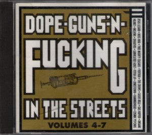 Compilation of Volumes 4 – 7 of the Ampetamine Reptile 7″ singles series. The Boss Hog track was originally featured on Dope Guns And Fucking In The Streets Vol. 4 (7″, US) which was limited to 2000 copies in total with 250 being on red vinyl. In 2010 Amphetamine Reptile released Volume 12 which included previously unreleased Boss Hog track Stain. |