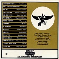 A1. Lubricated Goat – Bad Times Recorded at Reciprical, Seattle Produced: Jack Endino A2. Thee Mighty Caesars – 1977 A3. Helmet – Impressionable A4. Gas Huffer – Before I Kill Again A5. Jonestown – Short Time Left A6. The Crows – Capitol Hillbillies A7. Jesus Lizard – The Pop Song A8. Unsane – Broke B1. Boss Hog – Red Bath B2. Vertigo – Big Black Bugs B3. Melvins – Euthenasia B4. Dwarves – Lesbian Nun B5. Casus Belli – Telemarketing B6. Hammerhead – Gremlin Stomp B7. Cosmic Psychos – Hard B8. Fetish 69 – Deep Scar Man |