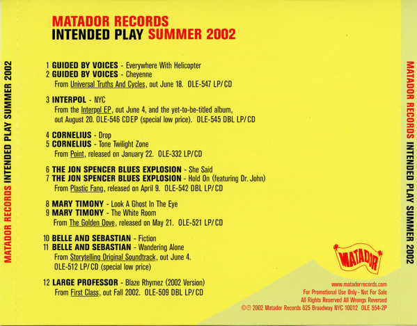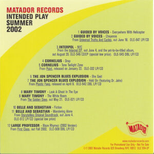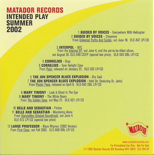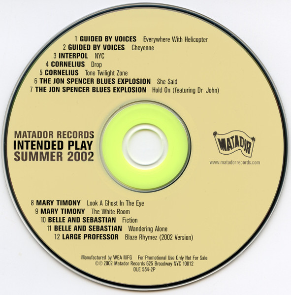 | 01. Guided By Voices – Everywhere With Helicopter 02. Guided By Voices – Cheyenne 03. Interpol – NYC 04. Cornelius – Drop 05. Cornelius – Tone Twilight Zone 06. The Jon Spencer Blues Explosion – She Said 07. The Jon Spencer Blues Explosion – Hold On 08. Mary Timony – Look A Ghost In The Eye 09. Mary Timony – The White Room 10. Belle And Sebastian – Fiction 11. Belle And Sebastian – Wandering Alone 12. Large Professor – Blaze Rhymez (2002 Version) |