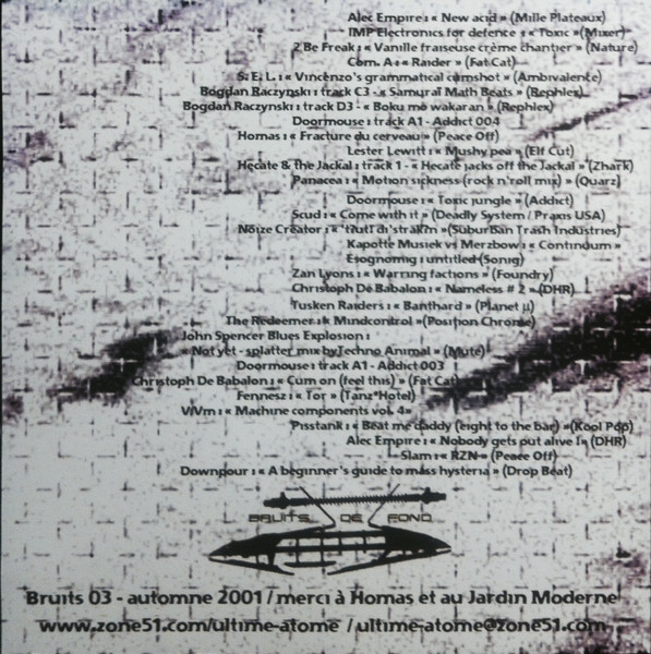 | 01. Alec Empire – New Acid 02. IMP Electronics For Defence – Toxic 03. 2 Be Freak – Vanille Fraiseuse Crème Chantier 04. Com.A – Raider 05. Syncopated Elevators Legacy – Vincenzo’s Grammatical Cumshot 06. Bogdan Raczynski – Are Igai Imi Ga Nai 07. Bogdan Raczynski – Untitled 08. Doormouse – Puddy Tairs 09. Homas – Fracture Du Cerveau 10. Lester Lewitt – Mushy Pea 11. Hecate & Jackal – Voluntarily 12. Panacea – Motion Sickness (Rock’N’Roll Mix) 13. Doormouse – Toxic Jungle 14. DJ Scud – Come With It 15. Noize Creator – T?utl di’strak?n 16. Kapotte Muziek vs. Merzbow – Continuum 17. Esognomig – Untitled 18. Zan Lyons – Warring Factions 19. Christoph De Babalon – Nameless #2 20. Tusken Raiders – Banthard 21. Redeemer – Mindcontrol 22. The Jon Spencer Blues Explosion – Not Yet (Splatter Mix) 23. Doormouse – Untitled 24. Christoph De Babalon – Cum On (Feel This) 25. Fennesz – Tor 26. V/Vm – Machine Components Vol. 4 27. Pisstank – Beat Me Daddy (Eight To The Bar) 28. Alec Empire – Nobody Gets Out Alive! 29. Slam – RZN 30. Downpour – A Beginner’s Guide To Mass Hysteria |