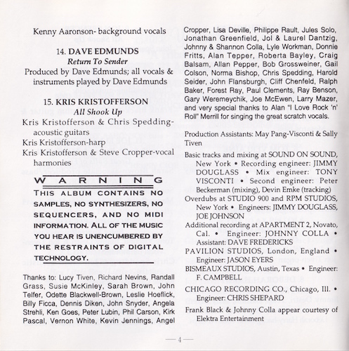 Background Vocals: Frank Black, Johnny Colla, Jol Dantzig, Lyle Workman, Tony Visconti, Sally Tiven and Graham Parker