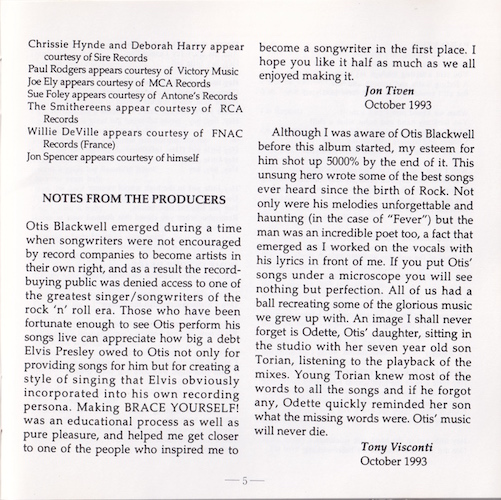 Otis Blackwell emerged during a time when songwriters were not encouraged by record companies to become artists in their own right, and as a result the record-buying public was denied access to one of the greatest singer/songwriters of the rock ‘n’ roll era. Those who have been fortunate enough to see Otis perform his songs live can appreciate how big a debt Elvis Presley owed to Otis not only for providing songs for him but for creating a style of singing that Elvis obviously incorporated into his own recording persona. Making BRACE YOURSELF! Was an educational process as well as pure pleasure, and helped me get closer to one of the people who inspired me to become a songwriter in the first place. I hope you like it half as much as we all enjoyed making it.