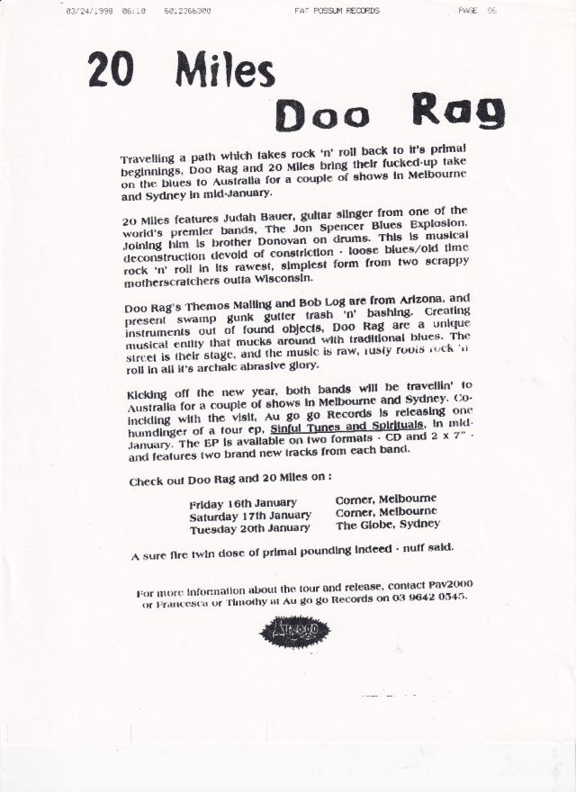 20 Miles and Doo Rag released the Australia-only split EP Sinful Tunes & Spirituals in July 1998.
