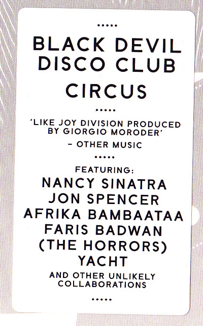 Pre-orders from blackdevildiscoclub.com include In Doubt (+ remixes), bonus tracks Chimera feat. Nancy Fortune and I See Your Mom feat. Galaxy Birthday and a download of the LP & CD versions of all tracks. Released by Lo Recordings / Alter K and distributed by Module. Pre-Orders from Rough Trade included an exclusive second CD featuring the following 7 bonus tracks: 01. I See You Mom Feat. Galaxy Birthday “In 2006, the mysterious 70s French Italo-disco veteran Bernard Fevre, who records as Black Devil Disco Club, resurfaced with 28 Later, an album of glassy electronic tracks. “In 2006, the mysterious 70s French Italo-disco veteran Bernard Fevre, who records as Black Devil Disco Club, resurfaced with 28 Later, an album of glassy electronic tracks. On April 12, he’ll return yet again when Lo releases the new Black Devil Disco Club album Circus, which features a ton of big-name collaborators. That’s the cover art above. Circus includes contributions from boldfaced names like Nancy Sinatra, Afrika Bambaataa, Faris Badwan of the Horrors and Cat’s Eyes, Claire Evans of YACHT, and Jon Spencer. Other guests include Cosmetics’ Aja Emma, CocknBullKid, Nancy Fortune, and Jo Apps.” – Pitchfork.com |