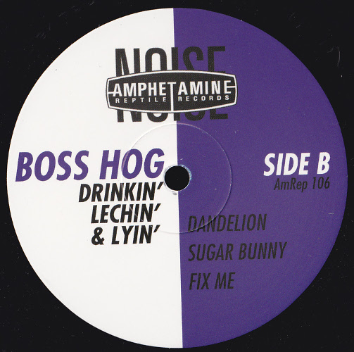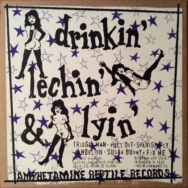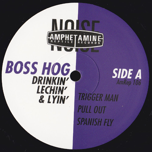 Also reissued on Purple/Black split vinyl (Mail Order Edition), White/Purple vinyl (Tour Edition) and CD. *it is unknown exactly when/where this version of the release was first available but presumable it was somewhere between May and July 2016. This particular copy, #28, was purchased at Union Pool, Brooklyn, New York on 13 August 2016. The original 1989 release had a stickered cover which censored the artwork, copies sold in Japan had the cover censored with the offending area scratched off by hand and the album was issued on vinyl (in Europe and the US) and cassette with an alternate cover design. The following excerpt comes from an interview in Fiz magazine (Issue #7, July/August 1993) and relates to the look of Cristina on the cover of the original vinyl version of this release (on which this lino-cut design is based): “Fiz: The first one has that real cheesecakse/pinup girl look to it. I like that kind of stuff. Fiz: Wow, I never even equated the two. I didn’t even realize she had a name. Cristina: Just a bit of trivia for you. But yeah, that’s what I was going for there. I actually had this make up artist there who painted my nipples black! It was really funny. Having some woman, while I’m sitting there having a cigarette, painting my nipples black. Fiz: Why would you do that? Cristina: (laughing) Because Femlins nipples are black! She’s just an outline. We were trying to make it as high contrast as possible, so it was like an outline with black gloves and boots, black hair and black nipples.” – Fiz Magazine The following comes from an interview with Cristina Martinez in S&M Magazine regarding the sleeve and reaction to it: “S&M: And you know I’m gonna ask this one as well. Why did you pose naked for the first album? And I bet you’re sick of this question. Cristina: I believe that the album cover should reflect the content of the material within the record… S&M: Which it does Cristina: …which it does, and it has in every case, and that’s always been important to me, and the first record was a real sort of raw exposure of myself, and a real changing point, and it was coming out for me. S&M: I believe you got some stick off your friends for doing it? Cristina: I did. A lot of people took it the wrong way and thought it was some sort of sexploitation-like cheap thrills, sort of shock value thing on my part, and that was not the case. It was disappointing.” – Gerry Mander / S&M Magazine Boss Hog – Drinkin’, Lechin’ & Lyin’ [1989] (LP, US) |