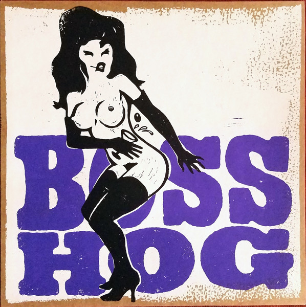 The original 1989 release had a stickered cover which censored the artwork, copies sold in Japan had the cover censored with the offending area scratched off by hand and the album was issued on vinyl (in Europe and the US) and cassette with an alternate cover design. The following excerpt comes from an interview in Fiz magazine (Issue #7, July/August 1993) and relates to the look of Cristina on the cover of the original vinyl version of this release (on which this lino-cut design is based): “Fiz: The first one has that real cheesecakse/pinup girl look to it. I like that kind of stuff. Fiz: Wow, I never even equated the two. I didn’t even realize she had a name. Cristina: Just a bit of trivia for you. But yeah, that’s what I was going for there. I actually had this make up artist there who painted my nipples black! It was really funny. Having some woman, while I’m sitting there having a cigarette, painting my nipples black. Fiz: Why would you do that? Cristina: (laughing) Because Femlins nipples are black! She’s just an outline. We were trying to make it as high contrast as possible, so it was like an outline with black gloves and boots, black hair and black nipples.” – Fiz Magazine The following comes from an interview with Cristina Martinez in S&M Magazine regarding the sleeve and reaction to it: “S&M: And you know I’m gonna ask this one as well. Why did you pose naked for the first album? And I bet you’re sick of this question. Cristina: I believe that the album cover should reflect the content of the material within the record… S&M: Which it does Cristina: …which it does, and it has in every case, and that’s always been important to me, and the first record was a real sort of raw exposure of myself, and a real changing point, and it was coming out for me. S&M: I believe you got some stick off your friends for doing it? Cristina: I did. A lot of people took it the wrong way and thought it was some sort of sexploitation-like cheap thrills, sort of shock value thing on my part, and that was not the case. It was disappointing.” – Gerry Mander / S&M Magazine Boss Hog – Drinkin’, Lechin’ & Lyin’ [1989] (LP, US) |