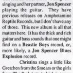 S&M: TJ’s, Newport 31/10/95 / Cristina Martinez Interview 31/10/95 / Boss Hog [Album Review] [5000 Words] (PRESS, UK) TEXT: “Cristina retains a wide smile for the entire set, evidence that she’s really enjoying this, I might have glanced a smile from Hollis but Jon is totally transformed when on stage, he’s charged up and comes to life, he was born to be an entertainer, I couldn’t imagine him doing anything else…” |