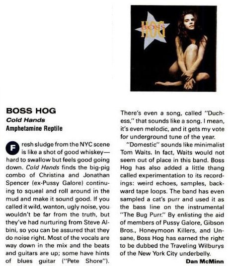 | Short review of Boss Hog album Cold Hands from May 1991 issue of Spin magazine. |
