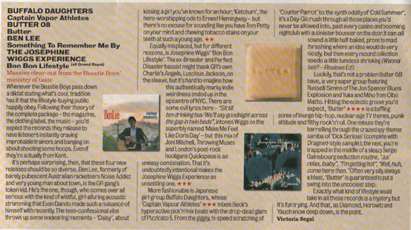 | “Luckily, that’s not a problem Butter 08 have, a very super group featuring Russell Simins of The Jon Spencer Blues Explosion and Yuka and Miho from Cibo Matto. Hitting the eclectic groove you’d expect, ‘Butter’ **** is a baffling scree of lounge hip-hop, nuclear age TV themes, punk attitude and filthy rock ‘n’ roll, One minute they’re barreling through the crazed spy-theme samba of ‘Dick-Serious’ (complete with Dragnet-style sample); the next, you’re trapped in the middle of a sleazy Serge Gainsbourg seduction routine. “Jus’ relax, baby”, “I’m getting hot”, “Well, huh, come here then”. Often very silly, always a blast, ‘Butter’ is guranteed to put a swing into the uncoolest step. Exactly what kind of lifestyle would take in all these records is a mystery, but it’s fun trying. And that, as Diamond, Horowitz and Yauch know deep down, is the point. – Victoria Segal” |