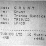 | Black vinyl test pressing of the Crunt album issued in plain white card sleeve with stickered cover, A4 information sheet, paper inner-sleeve and hand-written labels showing catalogue number and date of production.