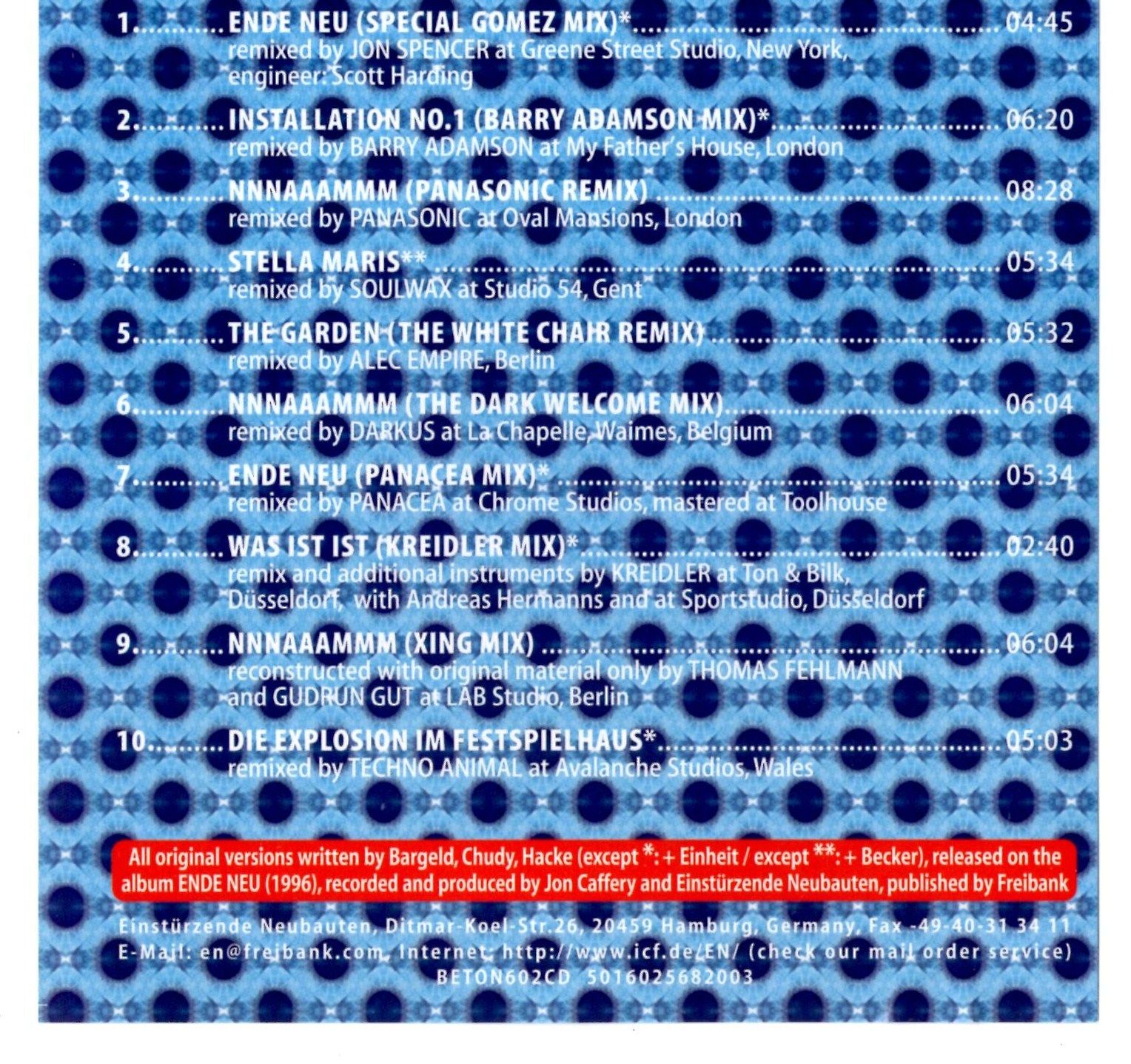 | 01. Ende Neu (Special Gomez Mix) Original Release: Ende Neu Writers: Bargeld/Chudy/Hacke/Einheit Recorded/Produced: Jon Caffery and Einsturzende Neubauten Published: Freibank Remix: Jon Spencer at Greene Street Studio, New York Engineer: Scott Harding 02. Installation No.1 (Barry Adamson Mix) 03. Nnnaaammm (Panasonic Remix) 04. Stella Maris 05. The Garden (The White Chair Remix) 06. Nnnaaammm (The Dark Welcome Mix) 07. Ende Neu (Panacea Mix) 08. Was Ist Ist (Kreidler Mix) 09. Nnnaaammm (Xing Mix) 10. Die Explosion Im Festspielhaus |