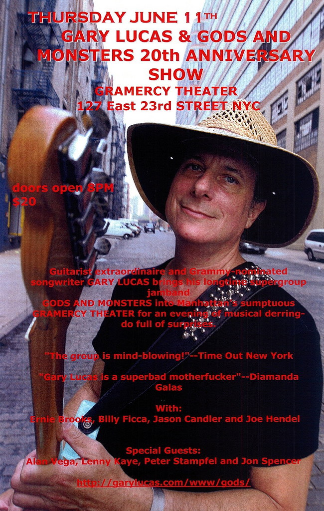 Poster for Gary Lucas & Gods and Monsters 20th Anniversary Show feat. Jon Spencer – Blender Theater at Gramercy, 127 East 23rd St, NYC, US.