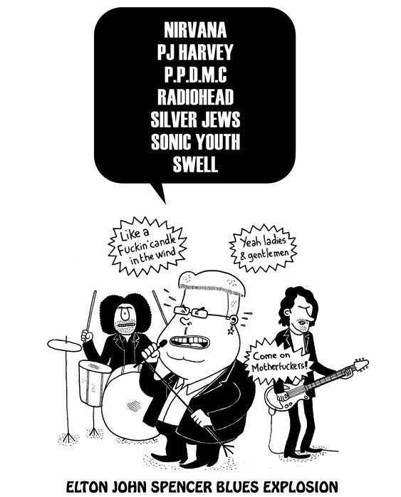 | 136 page book Gimme Indie Rock featuring artwork by Half Bob including this image of The Elton John Blues Explosion. |