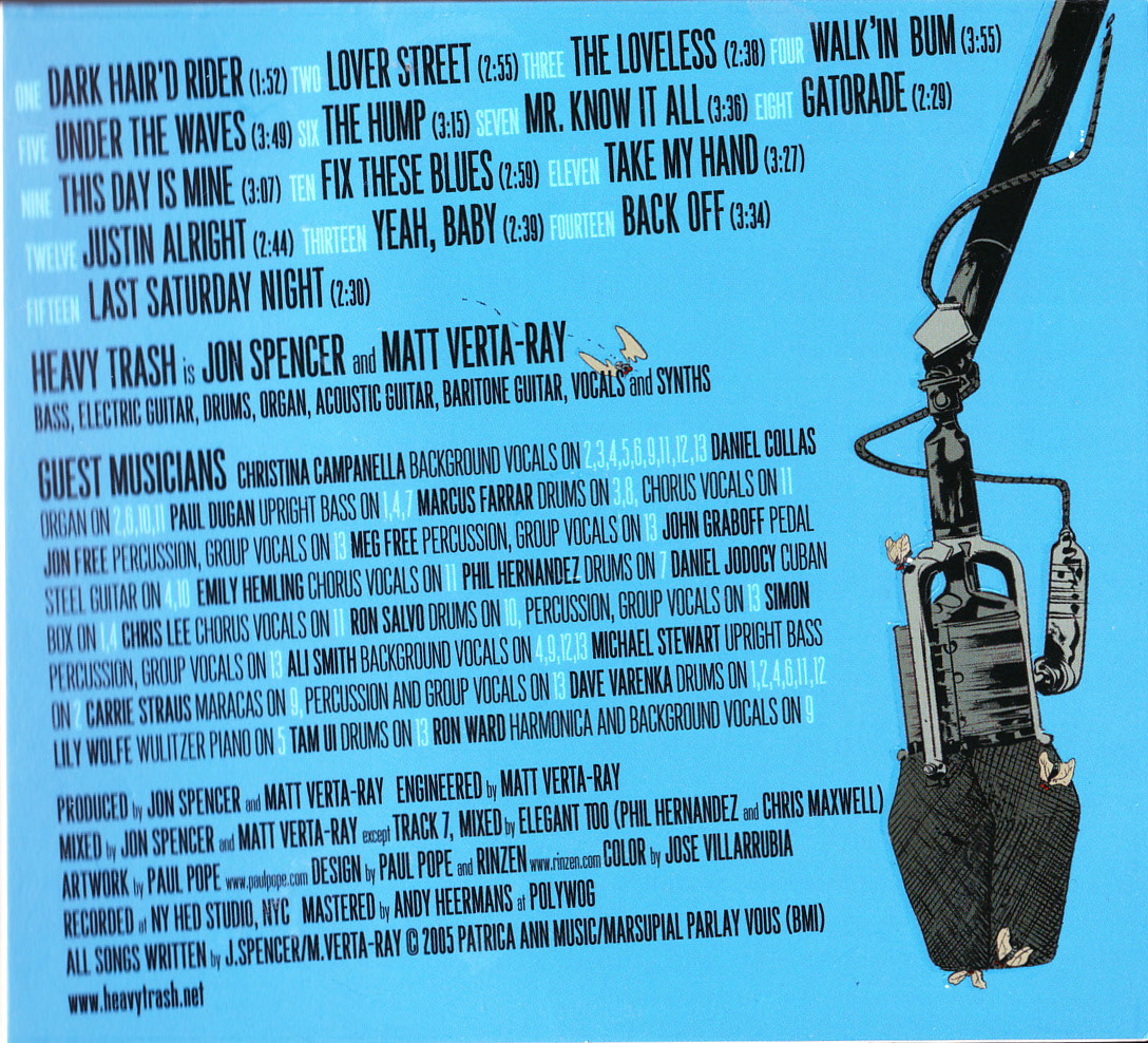 Produced by Jon Spencer and Matt Verta-Ray Engineered by Matt Verta-Ray Recorded at NY Hed Studio, NYC Mastered by Andy Heermans at Polywog All Songs © 2005 Patricia Ann Music/Marsupial Parlay Vous (BMI) Bass/Electric Guitar/Drums/Organ/Acoustic Guitar/Baritone Guitar/Vocals/Synths: Jon Spencer and Matt Verta-Ray [additional performers credited on relevant songs] 01. Dark Hair’d Rider 02. Lover Street 03. The Loveless 04. Walking Bum 05. Under The Waves 06. The Hump 07. Mr. Know It All 08. Gatorade 09. This Day Is Mine 10. Fix These Blues 11. Take My Hand 12. Justine Alright 13. Yeah Baby 14. Back Off 15. Last Saturday Night |