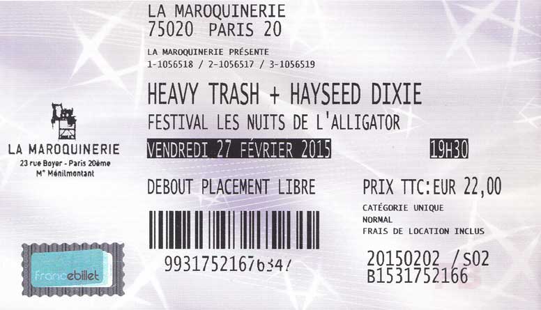 Heavy Trash show at Les Nuits de l’Alligator, La Maroquinerie, 23 rue Boyer, 75020 Paris, France with Bloodshot Bill and Hayseed Dixie on 27 February 2015.