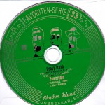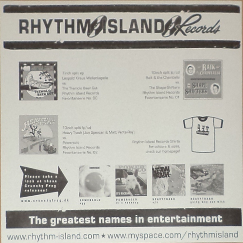 Also available as Jewelcase CD which includes a photo of Powersolo and Heavy Trash taken during their US summer tour of 2007 but is not present on the 10″ artwork. Liebe Auf Den Ersten Blick by Heavy Trash is a cover of a D.A.F. track (RELEASE) and the vinyl run-out groove engraving features the German text “Du machst mich verliebt” (Side A) and “Du machst mich verrückt” (Side B) which is taken from the original lyrics of the song. A rough English translation of this is “You drive me crazy” (Side A) / “You make me fall in love” (Side B) and I believe the song title is “Love at first sight”. This version features sleeve-notes which do not appear on the CD format. The bottom right-hand corner of the rear sleeve features the text ‘gestaltungsimonschmiede’ only in it’s mirror-image version. See images above for the text the correct way around. This is the name of ‘Simon Schmieder Gestaltung’ who did the artwork/graphic design for this record. The cover/rear paintings are by ‘Marsn’ (who is also in the band Mongouse). The spine on the regular cd version gives the catalogue number as ‘RIR.NO2’ but this is not featured on the 10″ sleeve anywhere. The run-out groove features the numbers ‘82275’ and ‘205.898’ which both could be catalogue numbers but there appears to be no corrisponding number on the CD. This is No. 2 in a series of split released put out by Rhythm Island Records (No. 1 featured Raik & the Chainballs/The Shape-Shifters). Available from Rhythm Island Records myspace page, Flight13.com and perhaps also the Crunchy Frog Vibrashop.com. |