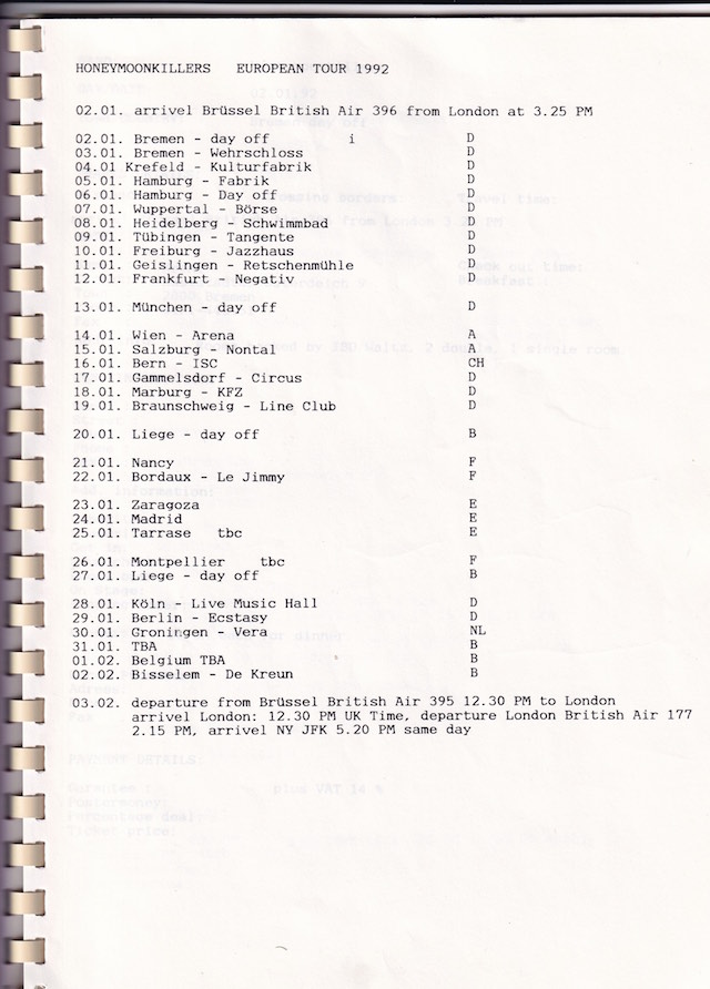 | Tour itinerary (full book but only cover and tour dates shown) and fax listing Honeymoon Killers European tour dates in January and February 1992 with Judah Bauer and Russell SiminsVIEW: Honeymoon Killers – European Tour Poster (January – February 1992) |