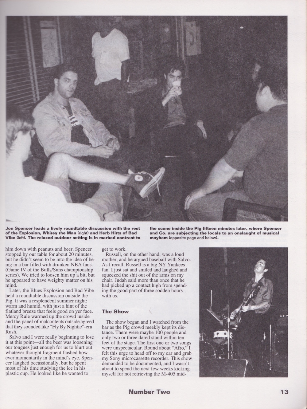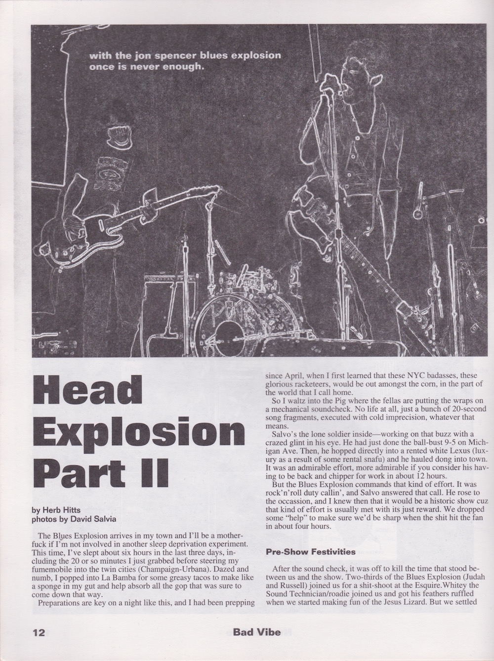 by Herb Hitts The Blues Explosion arrives in my town and I’ll be a motherfuck if I’m not involved in another sleep depravation experiment. This time, I’ve slept about six hours in the last three days, including the 20 or so minutes I just grabbed before steering my fumemobile into the twin cities (Champaign-Urbana). Dazed and numb, I popped into La Bamba for some greasy tacos to make like a sponge in my guy and help absorb all the gop that was sure to come down that way. Preparations are key on a night like this, and I had been prepping since April, when I first learned that these NYC badasses, these glorious racketeers, would be out amongst the corn, in the part of the world that I call home. So I waltz into the Pig where the fellas are putting the wraps on a mechanical soundcheck. No life at all, just a bunch of 20-second song fragments, executed with cold imprecision, whatever that means. Salvo’s the long soldier inside – working on that buzz with a crazed glint in his eye. He had just done the ball-bust 9-5 on Michigan Ave. Then, he hopped directly into a rented white Lexus (luxury as a result of some rental snafu) and he hauled dong into town. It was an admirable effort, more admirable if you consider his having to be back and chipper for work in about 12 hours. But the Blues Explosion commands that kind of effort. It was rock ‘n’ roll duty callin’, and Salvo answered that call. he rose to the occasion, and I knew then that it would be a historic show cuz some “help” to make sure we’d be sharp when the shit hit the fan in about four hours. Pre-Show Festivities After the sound check, it was off to kill the time that stood between us and the show. Two-thirds of the Blues Explosion (Judah and Russell) joined us for a shit-shoot at the Esquire. Whitey the Sound Technician/roadie joined us and got his feathers ruffled when we started making fun of the Jesus Lizard. But we settled him down with peanuts and beer. Spencer stopped by our table for about 20 minutes, but he didn’t seem to be into the idea of being in a bar filled with drunken NBA fans. (Game IV of the Bulls/Suns championship series). We tried to loosen him up a bit, but he appeared to have a weighty matter on his mind. Later, the Blues Explosion and Bad Vibe held a roundtable discussion outisde the Pig. It was a resplendent summer night: warm and humid, with just a hint of the flatland breeze that feels good on yer face. Mercy Rule warmed up the crowd inside and the panel of malcontents outside agreed that they sounded like “Fly By Nightie”-era Rush. Salvo and I were really beginning to lose it at this point – all the beer was loosening our tongues just enough for us to blurt out whatever thought fragment flashed however momentarily in the mind’s eye. Spencer laughed occasionally, but he spent most of his time studying the ice in his plastic cip. He looked like he wanted to get to work. Russell, on the other hand, was a loud mother, and he argued baseball with Salvo. As I recall, Russell is a big NY Yankees fan. I just sat and smiled and laughed and squeezed the shit out of the arms on my chair. Judah said more than once that he had picked up a contact high from spending the good part of three sodden hours with us. The Show The show began and I watched from the bar as the Pig crowd meekly kept its distance. There were maybe 100 people and only two or three dared stand within ten feet of the stage. The first one or two songs were unspectacular. Round about “Afro,” I felt this urge to head off to my car and grab my Sony microcassette recorder. This show demanded to be documented, and I wasn’t about to spend the next few weeks kicking myself for not retrieving the M-405 mid-show. The car was a block away, but I was there and back in the wink of an eye. Then it was inside and past all the dirties to my own little spot about four feet back from the stage. By now, the band had found its focus. Millieseconds separated songs, and the three now were one, tuned to the same crazed frequency. The locomotive-style jam in “Soul Typecast” was followed by a speedy “Bent” that the boys raced to finish. The crowd was onboard, and so was I. The goods were being delivered in ferocious fashion. I hooted and hollered crazily between and during songs, and it was all captured on the M-405. Everything was played so fucking fast at the Pig that night, “The Feeling of Love” was hyper-frenzied with Judah blowin’, Russell stompin’ and Jon moaning and wailing and shit. “Backslider” was a lesson in rock dynamics, as mountains of fuzzy guitars and “Shit, mans!!!” returned the song from its ominous break. Savage. Awesome. Like nothing I’ve seen or heard before. Me: WHOOOOOOOOOO!!!!!!!!!! Mo’ Random Notes on the Show Spencer writhes about, possessed by Presley during the amazing “Vacuum of Loneliness” – his tortured soul dragged over shards o’ glass for all to see. The wailin’ theremin spits out sound and adds to the cathartic confusion. If this is real and not theatre, I’m disturbed. He mumbles something about mashed potatoes and italian dressing and then plunges into the netherworld that is the inside the world of the Blues Explosion. “Turn your radio uppppp!!!” (screamed maniacally), Jon and Judah yell “inside” at each other. People are numbed by Russell’s relentless baseball-bat-on-a-car-hood snare. Then, with everyone in a trance, the band stops for a second, and Spencer-the master of knowing where sound (or the lack of it) belongs-does a little theremin burp and it blows the minds of a couple of concert-goers who go: “yeah!” after his handshake with the thin air. Spencer yells “inside” a bunch more times, and then he goes: “Hunnhhh” and Russell screams “Innsyyddeeee” real fucking loud (sans mike) a buncha times and then the set is over. The crowd goes wild, just a lot of clappin’ from people who were hardly breathing about thirty minutes ago. They’