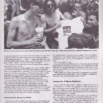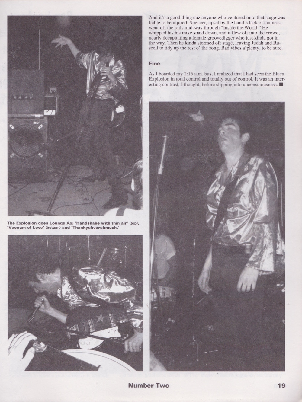 Photo Captions: Page 2: Jon Spencer leads a lively roundtable discussion with the rest of the Explosion, Whitey the Man (right) and Herb Hitts of Bad Vibe (left). The relaxed outdoor setting is in marked contrast to the scene inside the Pig fifteen minutes later, where Spencer and Co. are subjecting the locals to an onslaught of musical mayhem. Page 3: Jon’s moanin’ and wailin’ and shit as he’s got a sweaty ‘Feeling of Love’. Page 4: Men or beasts? Page 5a: Here it is, folks. The legendary ’78-style Chevy van, with wood panellin’. That’s crazy. Page 7: Curious locals want to know more about the funny men with the white skin. Thirty seconds later a projectile landed in our midst. Page 8: The Explosion does Lounge Ax: ‘Handshake with thin air’ (top), ‘Vacuum of Love’ (bottom) and ‘Thankyuhveruhmush.’ Thanks to Skeleton Boy for the scans. |