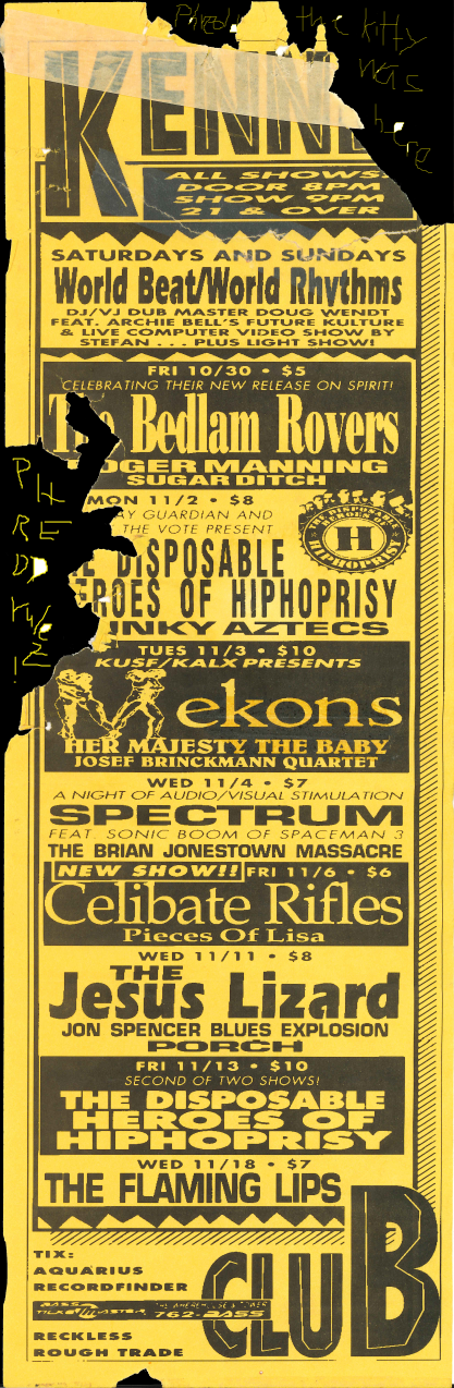 The Jon Spencer Blues Explosion show at the Kennel Club, 628 Divisadero, San Francisco, CA, US with Jesus Lizard and Porch on 11 November 1992.