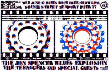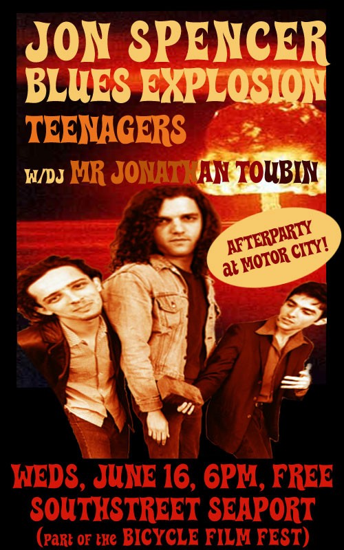 The New York Night Train poster (with incorrect date) was sent out via the NYNT myspace page along with the following message: “Bicycle Film Fest Party with Jon Spencer Blues Explosion & The Teenagers w/DJ Mr. Jonathan Toubin, South Street Seaport, Pier 17, 6pm, FREE: The legendary Jon Spencer Blues Explosion has reunited for this awesome free outdoor gig at the South Street Seaport and New York Night Train’s own Mr. Jonathan Toubin has been chosen to DJ! and, afterwards, New York Night Train throws the show’s afterparty…