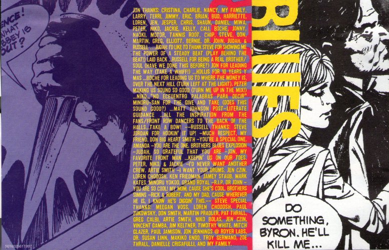 | “Jon thanks: Cristina, Charlie, Nancy, My Family, Larry, Terri, Eric, Brian, Bud, Harriette, Loren, Jen, Jesper, Chris, Shaun, Daniel, Miwa, Peter, Niko, Jackie, Kelly, Cali, Boche, Jonny, Naoki, Motor, Tannis Root, Chip, Steve, Don, Martin, Greg, Elliott, Bernie, Dr. John, Judah, & Russell …Judah: I’d like to thank Steve for showing me the power of a steady beat (Play behind the beat!) laid back …Russell for being a real brother/Soul (Have we done this before?) Jon for leading the way (Take a whiff!) …Hollis for 10 years Y Mas …Boche for leading is to where the money is, Over the next hill (Turn left at the light), Peter making us sound so good (Turn me up in the mix!) …Niko… “No Eceuentro palabras para decir” Minoru -San for the give and take (Does this sound good?) …Matt Johnson Post-Literate guidance …all the inspiration from the fans/front row dancers to the back of the halls…take a bow! –Russell Thanks: Steve Jordan for hookin’ it up! – Much respect, My friend, Don Big Heart Smith – You’re a special one. Amanda – You are the one, Brothers Blues Explosion – Judah, so grateful that you are – Jon, my favourite front man …Keepin’ us on our toes. Peter, Niko & Jackie – I’d never want another crew. Artie Smith – I want your drums. Jen Czin. Loren Chodosh. Ken Friedman. Jamey Staub. Mark Kates. Minoru Yokoo. Grand Royal. – R.I.P. Dr John – You are so cool! My mom, cause she’s cool. Brothers Simins – Rick & Robert. And my Dad, cause wherever he is, I know he’s diggin’ this. –Steve Special thanks: Meegan Voss, Loren Chodosh, Paul Zukowsky, Don Smith, Martin Pradler, Pat Thrall, Greg Calbi, Artie Smith, Niko Bolas, Jen Czin, Vincent Gamba, Jim Keltner, Timothy White, Mitch Glazer, Paul Jamison, Jon Jennings @ Royer Labs, Dr. Susan Linn, Makikio Endo, Troy Germano, Zoe Thrall, Danielle Crisafulli, and my family.” | |