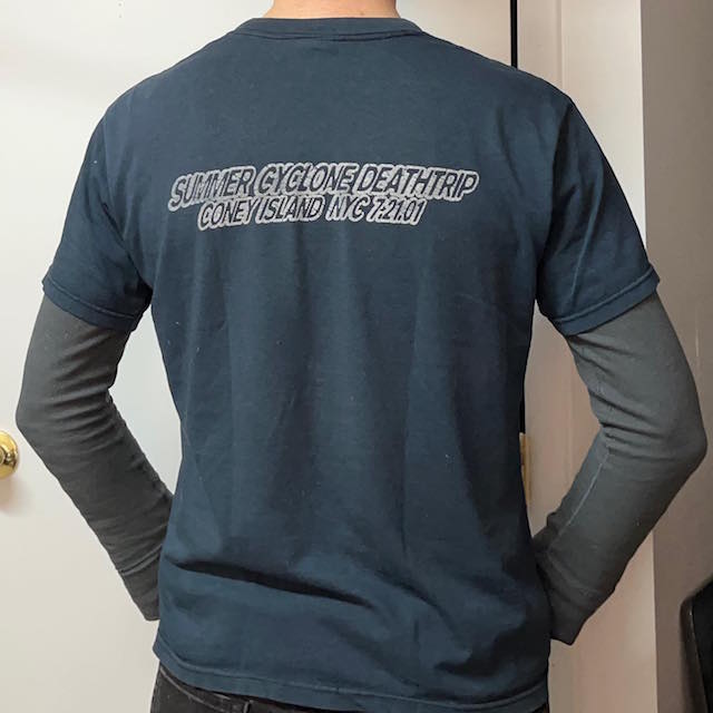 The rear printing of the shirt features text reading ‘Summer Cyclone Deathtrip, Coney Island, NYC 7.21.01’. There was also a similar shirt without the rear print. The front printing uses a style of text similar to the Controversial Negro sleeve and a promotional sticker from the time. The Reese’s Style shirt used the same logo with a different colouring. |