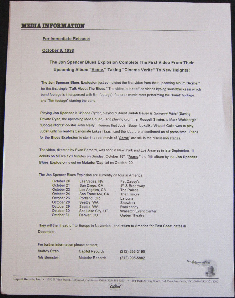 | Press release sent out by Matador Records to promote The Jon Spencer Blues Explosion video for Talk About The Blues from the album Acme. |